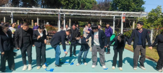 首個重磅項目——“十人九足一圈到底”協(xié)同賽,將賽事推向了第一個高潮。這是一個極其考驗團隊協(xié)調(diào)性與統(tǒng)一性的復合型項目,要求十名隊員不僅要用綁帶將相鄰的腿兩兩綁住,形成“十人九條腿”的奇特模式協(xié)同前行,還需在到達終點后共同協(xié)作,讓一個呼啦圈穿過所有人的身體,完成“一圈到底”。